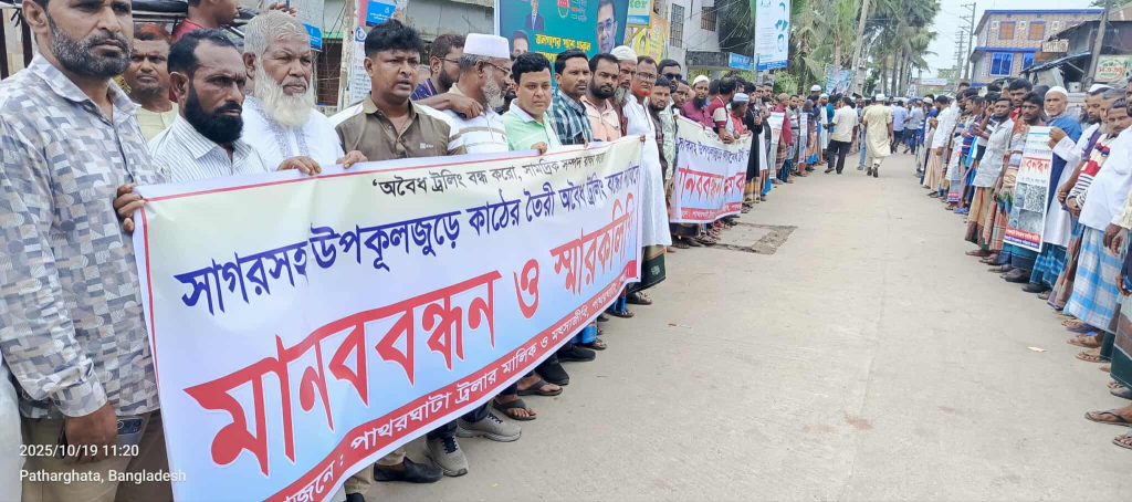 সাগরে অবৈধ ট্রলিং ট্রলার বন্ধের দাবিতে পাথরঘাটায় জেলেদের মানববন্ধন